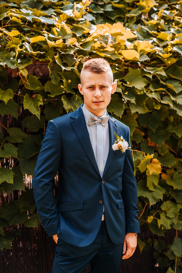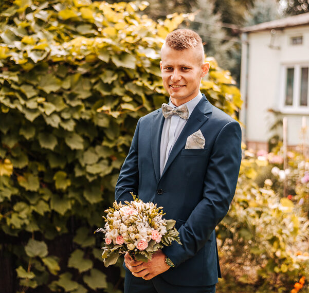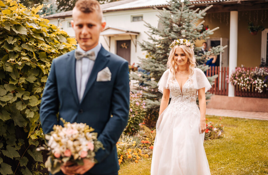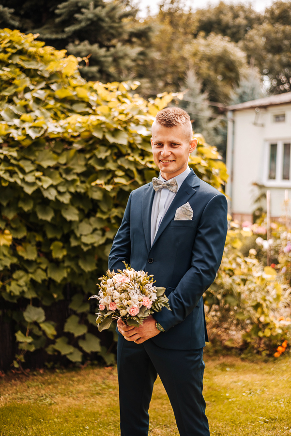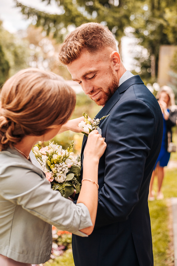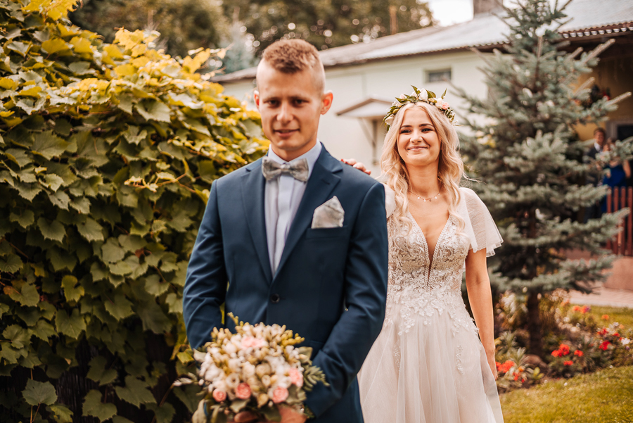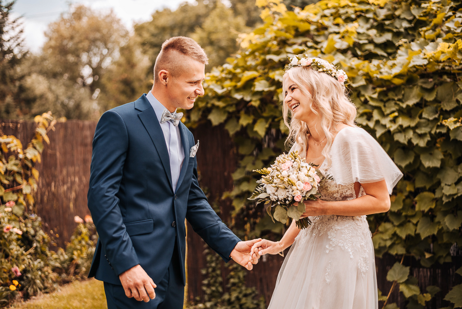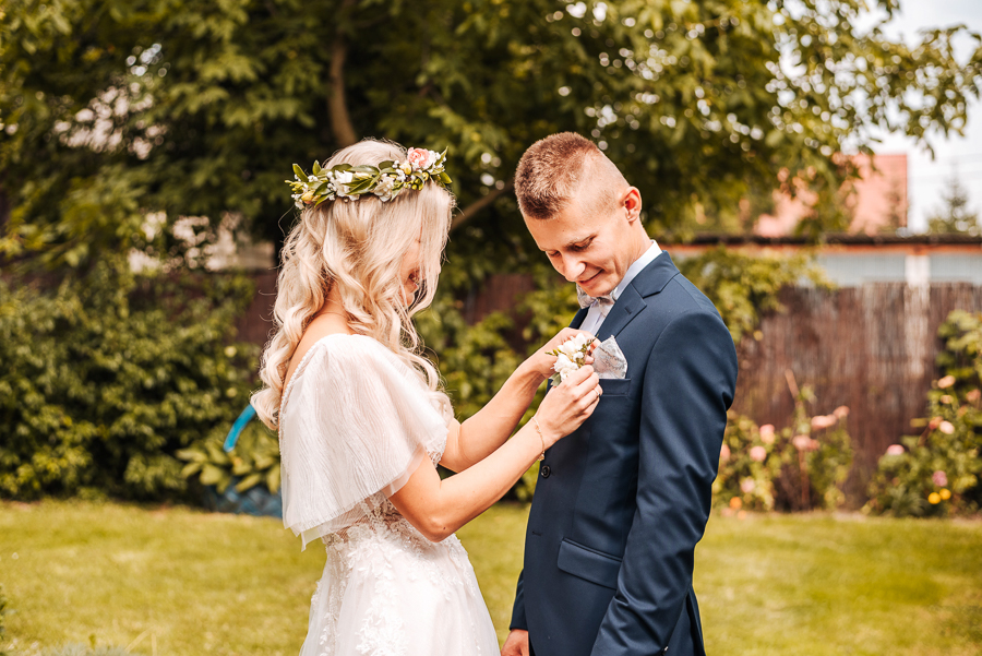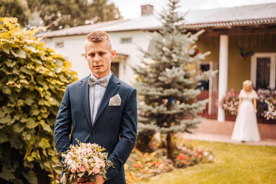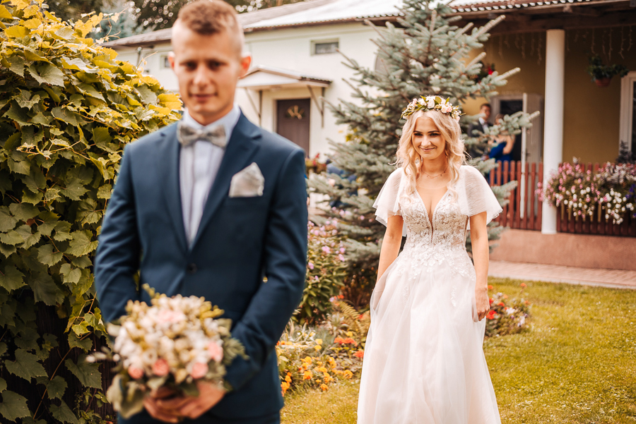 Tego dnia mieliśmy cudowną pogodę, która pozwoliła nam zrobić first look w ogrodzie. Ogromnie się cieszę, kiedy zgadzacie się na taką formę pierwszego zobaczenia swojej drugiej połówki. Jest to często bardzo wzruszający, a zarazem radosny moment i chwila tylko dla was. Wiadomo w dniu ślubu wszystko dzieje się bardzo szybko – szczególnie dla młodych. Dlatego warto na chwilę zwolnić tępo i powiedzieć drugiej połówce kilka słów od serca.